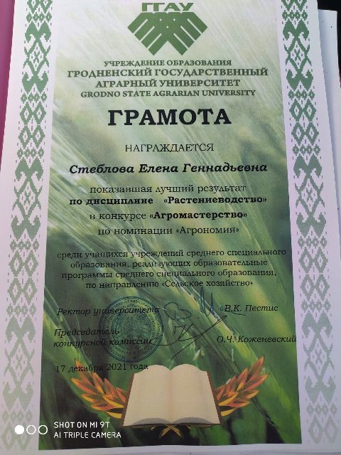 Поздравляем наших учащихся Стеблову Елену, Рудовича Андрея и Игошину Ольгу, занявших третье общекомандное место в Конкурсе «Агромастерство» среди учащихся учреждений среднего специального образования по направлению образования «Сельское хозяйство» в номинации «Агрономия». Стеблова Елена заняла первое место в личном зачёте по дисциплине «Растениеводство».