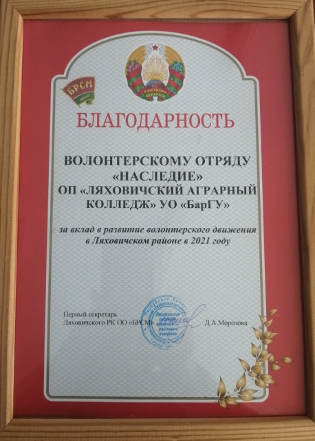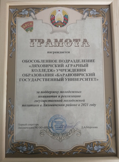 По итогам работы за 2021 год ОП «Ляховичский аграрный колледж» УО «БарГУ» наградили грамотой Ляховичского РК ОО «БРСМ», а также благодарственные письма были вручены молодежному отряду охраны правопорядка «Сапсан» и волонтерскому отряду «Наследие», действующим на базе нашего колледжа.