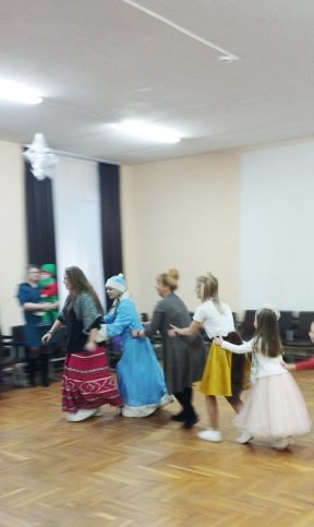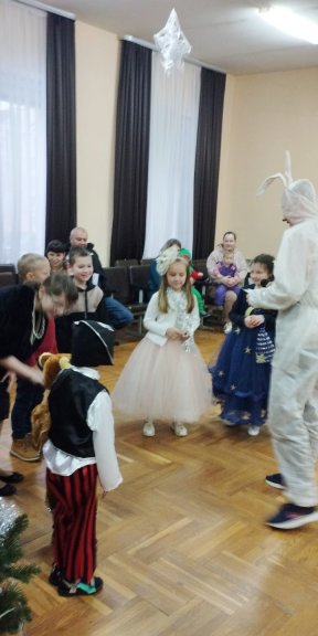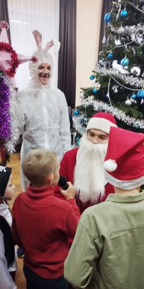 На новогоднем театрализованном представлении вокруг Елки Дед Мороз, Снегурочка, Леший, Баба Яга, Лиса, Кикимора, Волшебник и символ года Заяц вместе с ребятами отгадывали загадки, водили хороводы, участвовали в викторинах и конкурсах.