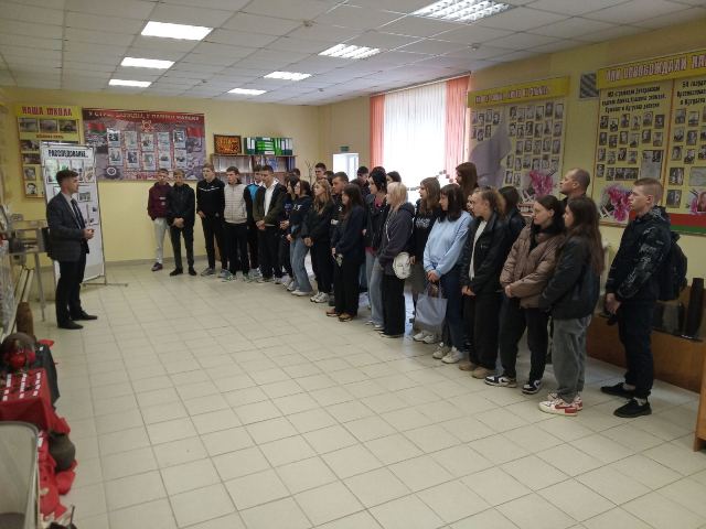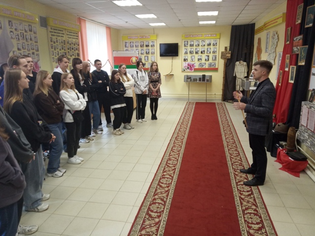 С целью ознакомления с выставкой "Память не умирает...", посвященной геноциду белорусского народа в годы Великой Отечественной войны, музей "Боевой и трудовой славы" в СШ № 2 г. Ляховичи посетили учащиеся первых курсов колледжа. Мероприятие посвящено Году мира и созидания.