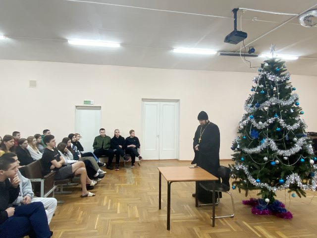 15 января 2024 года в общежитии колледжа прошла встреча учащихся с иереем Максимом Долгим, настоятелем храма Воздвижения Креста Господня в г.Ляховичи. Священник поздравил всех со светлым праздником Христова Рождества и рассказал участникам встречи о духовном смысле, значении, традициях празднования Рождества Христова. Батюшка отметил, что сегодня в государстве созданы все условия, чтобы каждый для себя мог открыть православную культуру, веру своих предков.