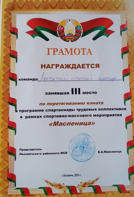 Участие принимали все желающие. Команда Ляховичского аграрного колледжа в программе спартакиады трудовых коллективов по перетягиванию канатов заняла почетное 3 место.