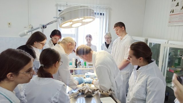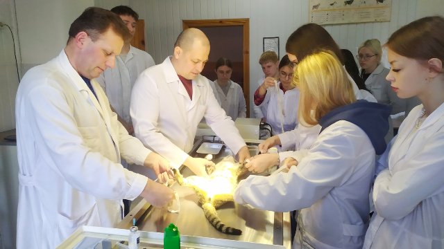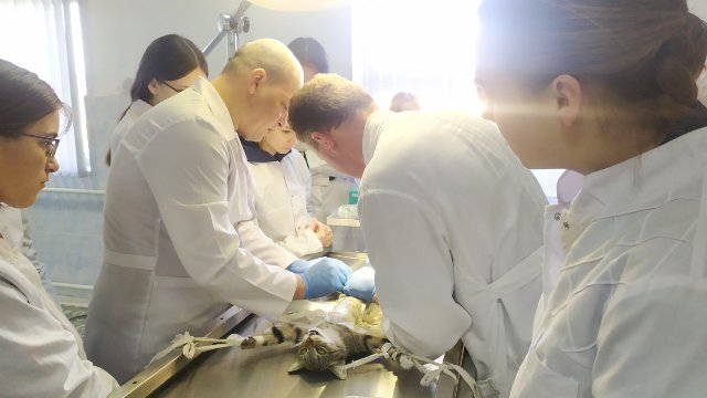 Заведующий ветеринарной клиникой колледжа Ковальчук В.П. и преподаватель учебного предмета «Акушерство, гинекология и биотехника размножения животных» Ахремцев О.В. с участием учащихся второго и третьего курса провели мастер-класс «Стерилизация кошки».