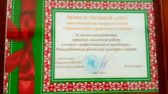 В городском доме культуры в профессиональный праздник чествовали работников физической культуры и спорта. Грамотой обособленного подразделения «Ляховичский аграрный колледж» учреждения образования «Барановичский государственный университет» за активное участие в педагогической, научно-исследовательской работе и спортивной жизни колледжа награждена преподаватель физвоспитания Бурчиц Оксана Викторовна.