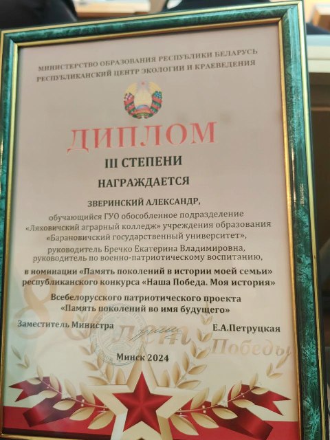 5 ноября 2024 года в г. Минске в Национальной библиотеке Беларуси прошёл республиканский форум «Память поколений во имя будущего», приуроченный к празднованию 80-й годовщины освобождения Республики Беларусь от немецко-фашистских захватчиков, в котором принял участие учащийся Обособленного подразделения "Ляховичский аграрный колледж" учреждения образования "Барановичский государственный университет" Зверинский Александр. В рамках форума прошло подведение итогов Всебелорусского патриотического проекта "Память поколений во имя будущего". Учащимся колледжа Зверинским Александром ( руководитель военно-патриотического воспитания Бречко Екатерина Владимировна) была представлена работа в Конкурсе "Наша Победа. Моя история", которая по достоинству оценена жюри Дипломом III степени.