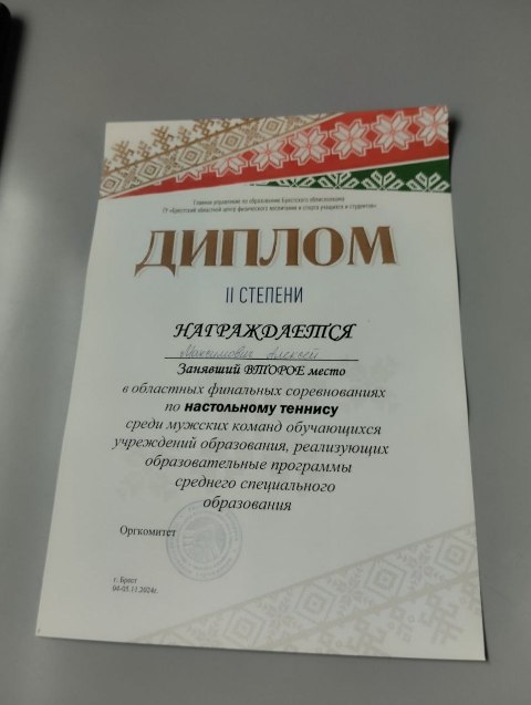 04-05 ноября 2024 в городе Бресте прошли областные финальные соревнования по настольному теннису среди мужских команд обучающихся учреждений образования, реализующих образовательные программы среднего специального образования в которых приняли учащиеся Ляховичского аграрного колледжа. Максимович Алексей Николаевич учащийся 31 А группы награжден Дипломом II степени.