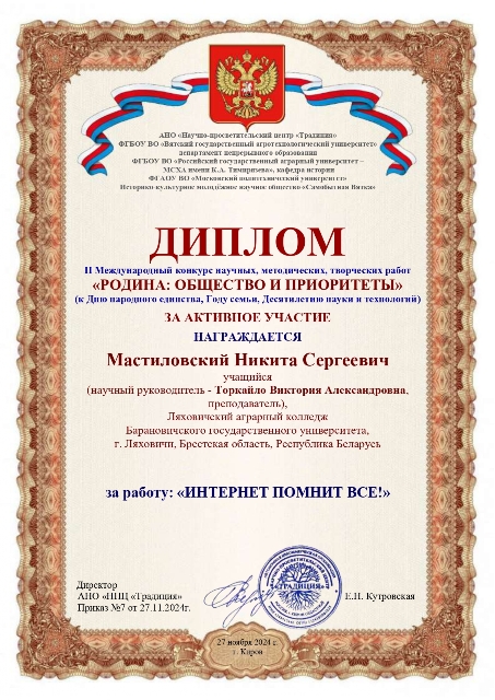 Мастиловский Никита, отмечен дипломом за активное участие за работу: «Интернет помнит всё!».