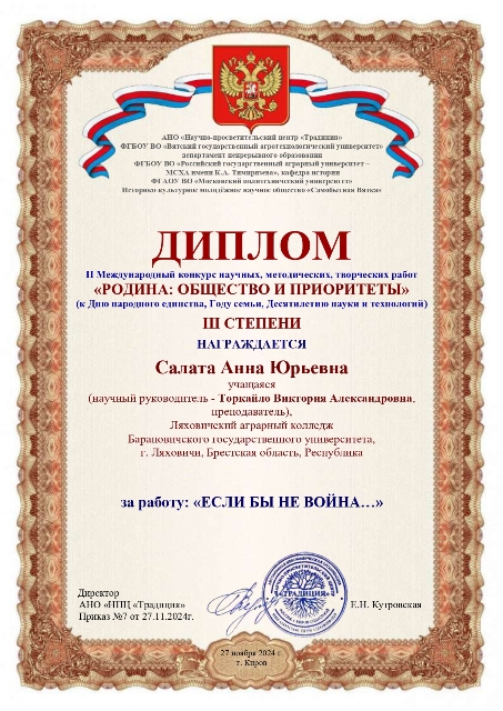 Салата Анна награждена Дипломом 3 степени за работу: «Если бы не война…».