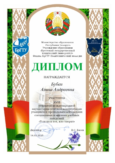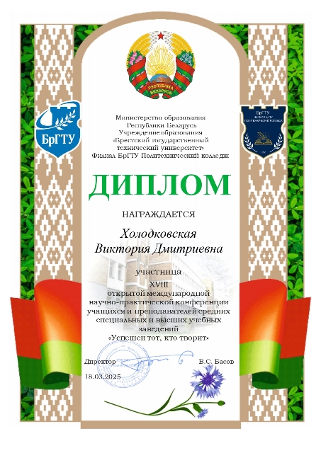 18 марта 2025 года учащиеся и преподаватели колледжа приняли участие (on-line) в XVIII открытой международной научно-практической конференции исследовательских и конструкторских работ учащихся и преподавателей средних специальных и высших учебных заведений «Успешен тот, кто творит», организатором которой являлся филиал учреждения образования «Брестский государственный технический университет» Политехнический колледж.