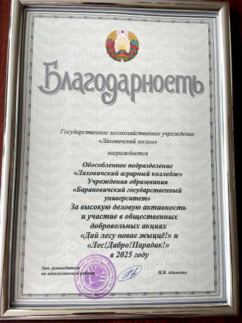 Колледж удостоен благодарности Государственного лесохозяйственного учреждения «Ляховичский лесхоз» за высокую деловую активность и активное участие в благотворительной акции «Дай лесу новае жыццё!». Благодарственное письмо было вручено руководству учебного заведения в знак признания усилий коллектива в поддержке экологических инициатив и содействия в проведении мероприятий по восстановлению зелёных насаждений.
