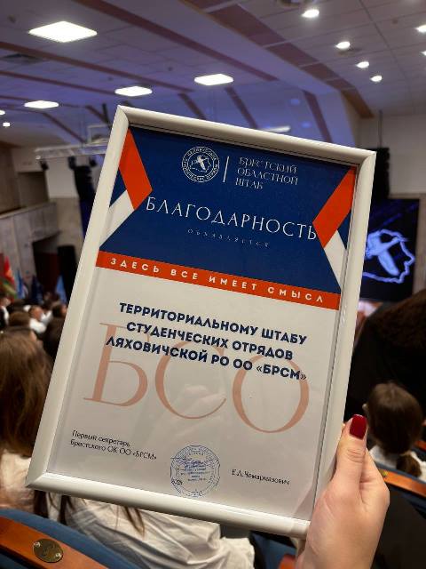 Территориальному штабу студенческих отрядов Ляховичской РОО ОО"БРСМ", который представляли учащиеся агроколледжа, вручена Благодарность Брестского обкома БРСМ. Благодарностью отмечено также ОАО "Ляховичский консервный завод" - одна из лучших принимающих организаций Брестской области. К слову, за 2025 год БРСМ Брестчины оказал помощь в трудоустройстве 6677 молодых людей. В нашем районе в студотрядах в этом году были трудоустроены 183 человека, рассказала первый секретарь Ляховичского райкома БРСМ Анастасия Демидович.