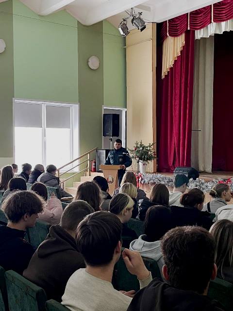 Для учащихся 1–4 курсов прошла профилактическая беседа по вопросам безопасности в зимнее время. Старший инспектор ИНиП РОЧС Рабцевич С.А. напомнил о правилах поведения выхода на лёд, недопустимости использования пиротехники, а также о правилах эксплуатации печного отопления в условиях сильных морозов. Беседа направлена на предупреждение чрезвычайных ситуаций и формирование у учащихся ответственного поведения.