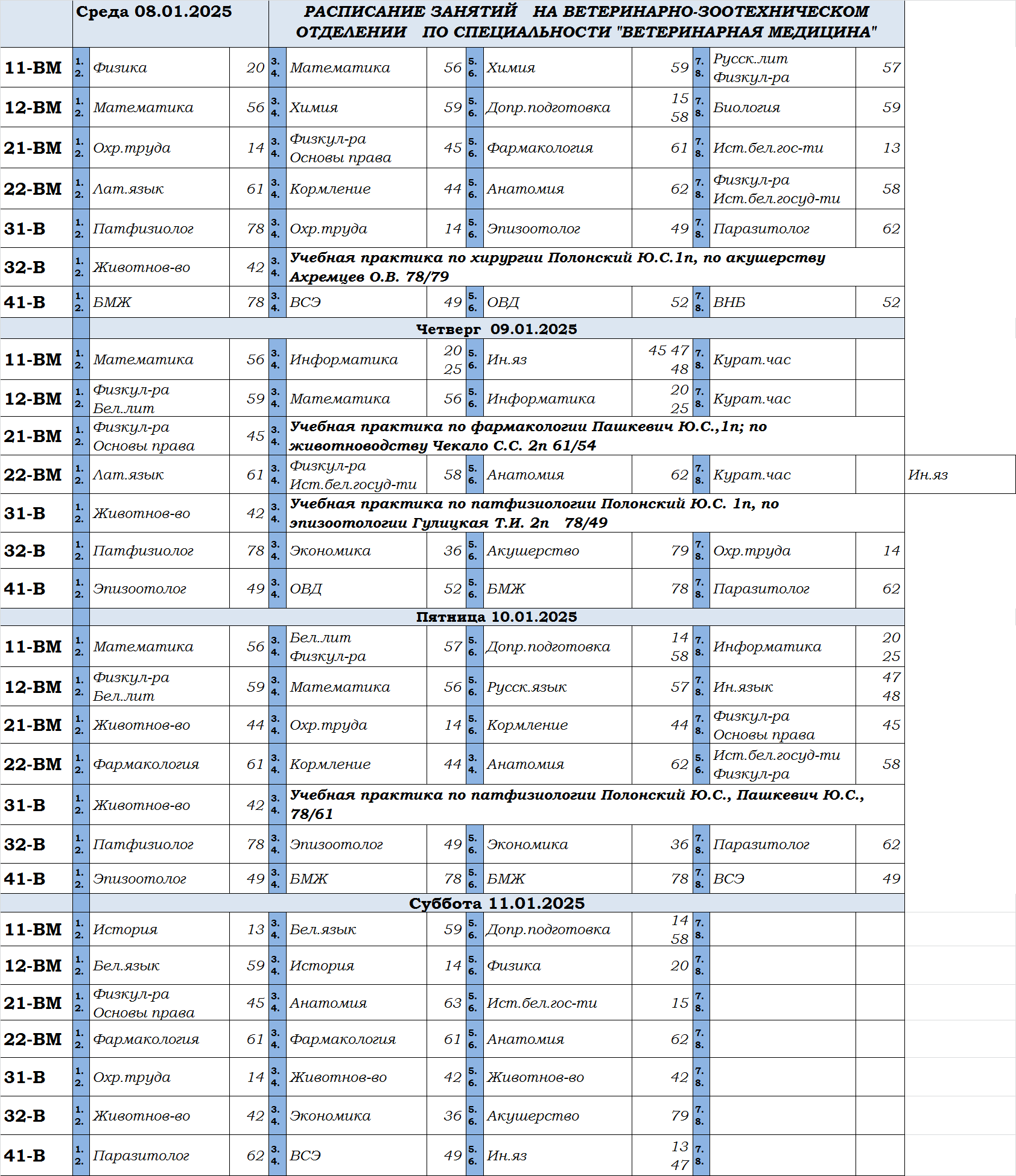 Расклад навучальных заняткаў